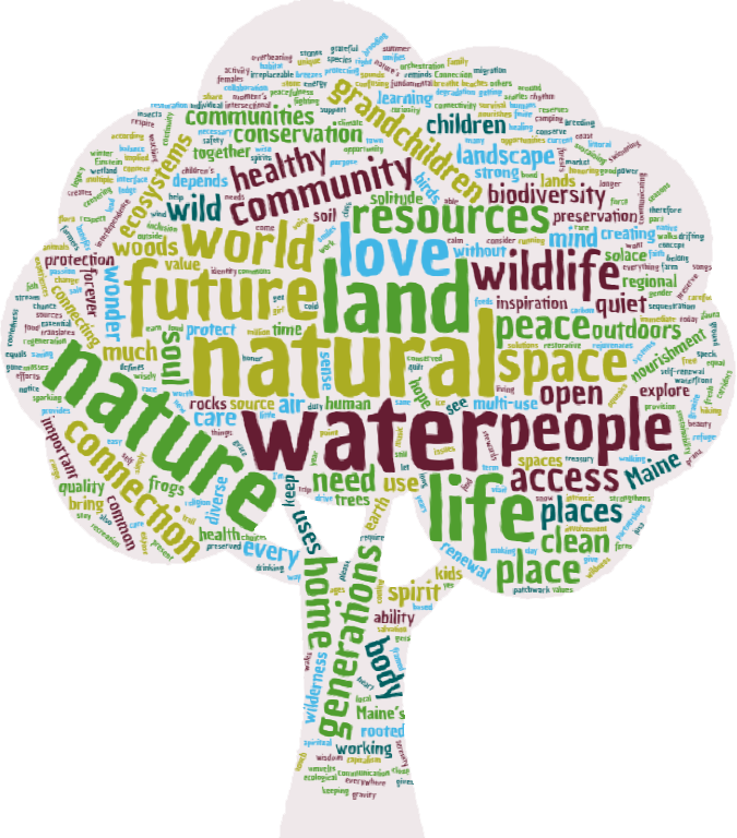 During the day at the Conference, attendees were invited to write a word, phrase, or sentence about what Maine’s natural resources mean to them on a paper “leaf” and tape it to our tree. We made this word cloud out of all the words people put on the tree. Pretty cool, huh?